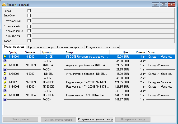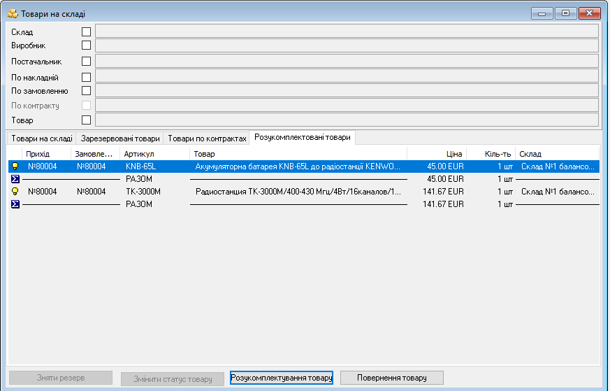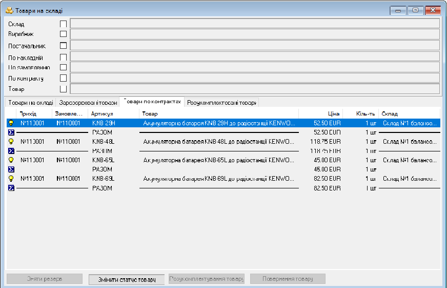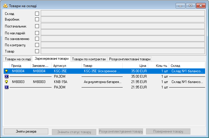 В разі необхідності ми можемо змінити статус товару - тобто перемістити його до вільних товарів на складі. Оскільки ці товари були замовлені за контрактом, то вони знову з'являться у вікні - Необхідні замовлення.